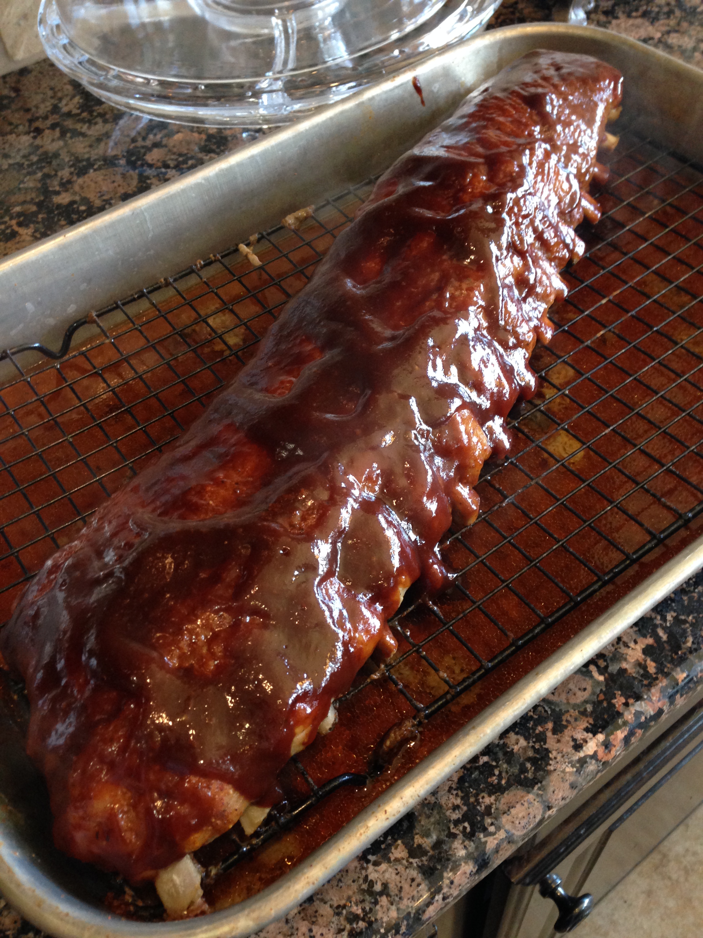 So, I had perfectly cooked, tender ribs but I wanted to firm up that sauce for a more caramelized finish. I placed the ribs uncovered under the broiler for 5 to 10 minutes, watching carefully to prevent those annoying unattended broiler mishaps: